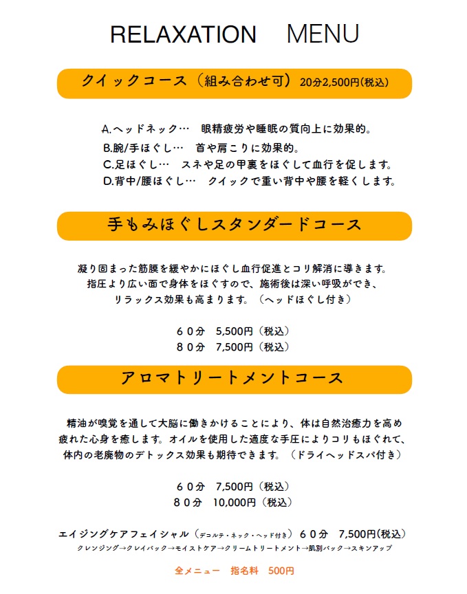 お買い物のついでや、お仕事の休憩時間、駅の電車待ちにも最適な20分からのクイックコースや、個室でゆったりとアロマボディトリートメントで心身のメンテナンスやリフレッシュはいかがでしょうか。お気軽にご利用ください。